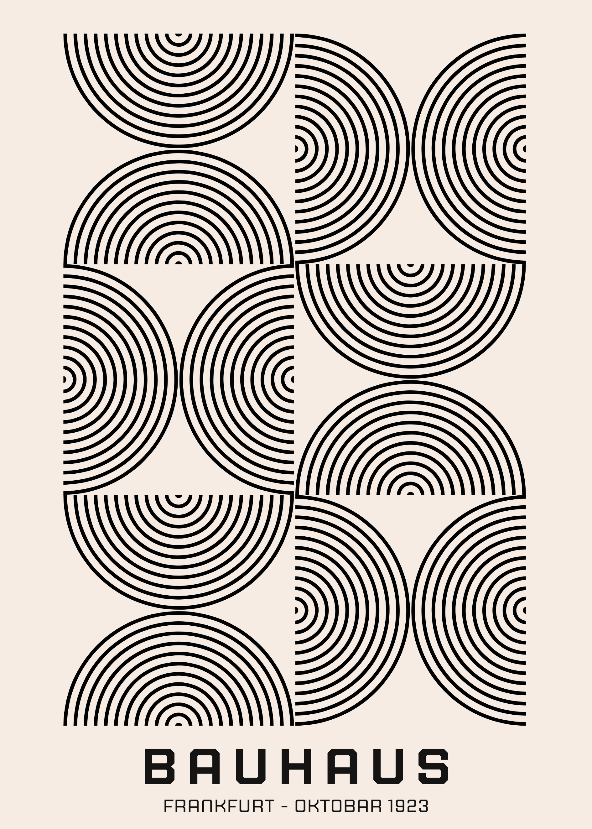 Denne Bauhaus-inspirerede plakat har et stærkt og samtidig roligt udtryk, hvor koncentriske cirkler gentages i et modulært mønster. De sorte linjer står skarpt mod den lyse baggrund og skaber en tydelig rytme, som giver plakaten dybde, bevægelse og grafisk balance. Et oplagt valg til det danske hjem, hvor nordisk minimalisme og klare linjer værdsættes.