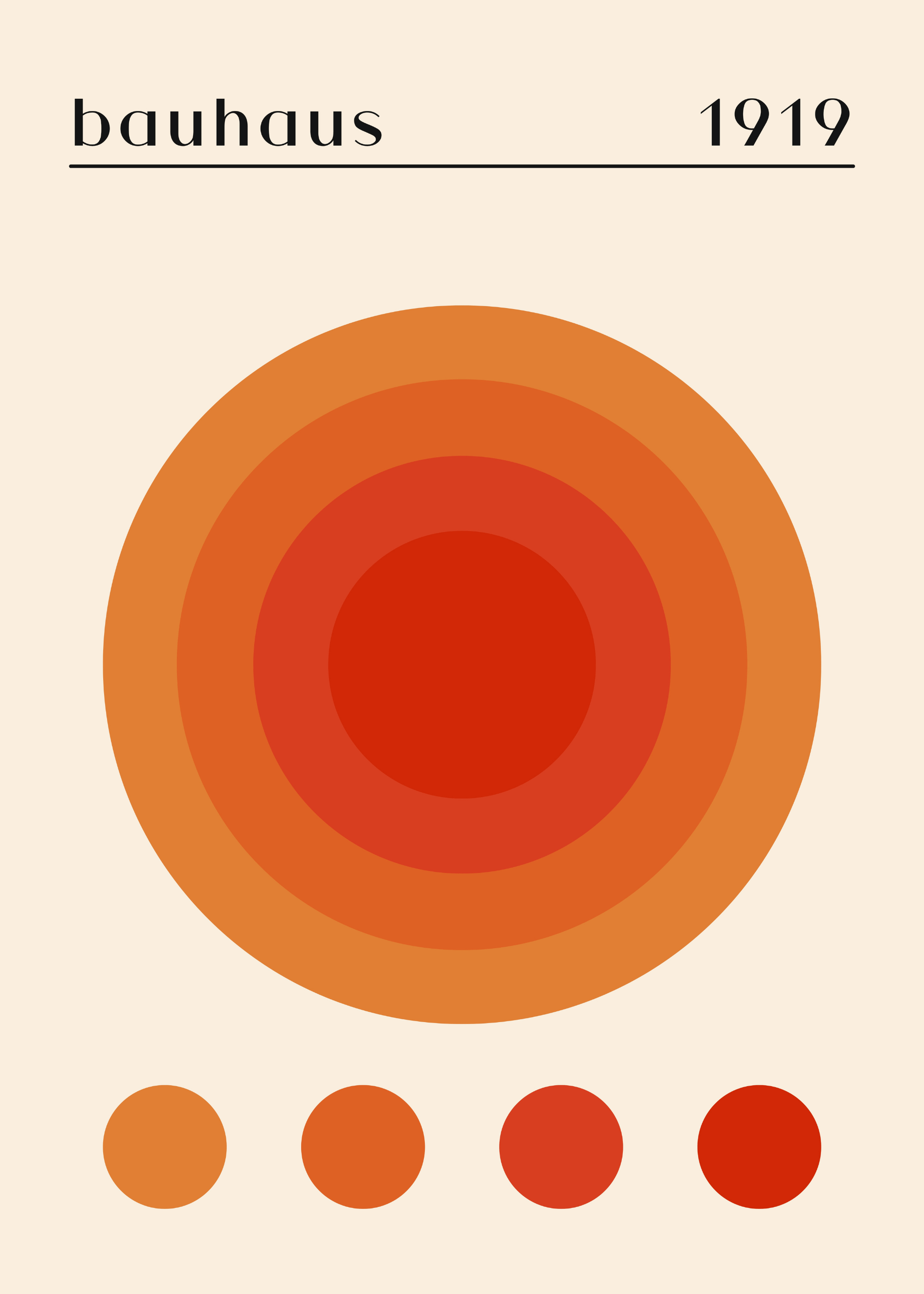 Denne Bauhaus-inspirerede plakat har et klart og roligt udtryk, hvor koncentriske cirkler danner et harmonisk og velafbalanceret motiv. Farverne bevæger sig fra dyb rød i centrum og ud i varme orange nuancer, hvilket skaber en naturlig overgang og en stærk visuel dybde. Et oplagt valg til det danske hjem, hvor nordisk enkelhed kombineres med varme farver.
