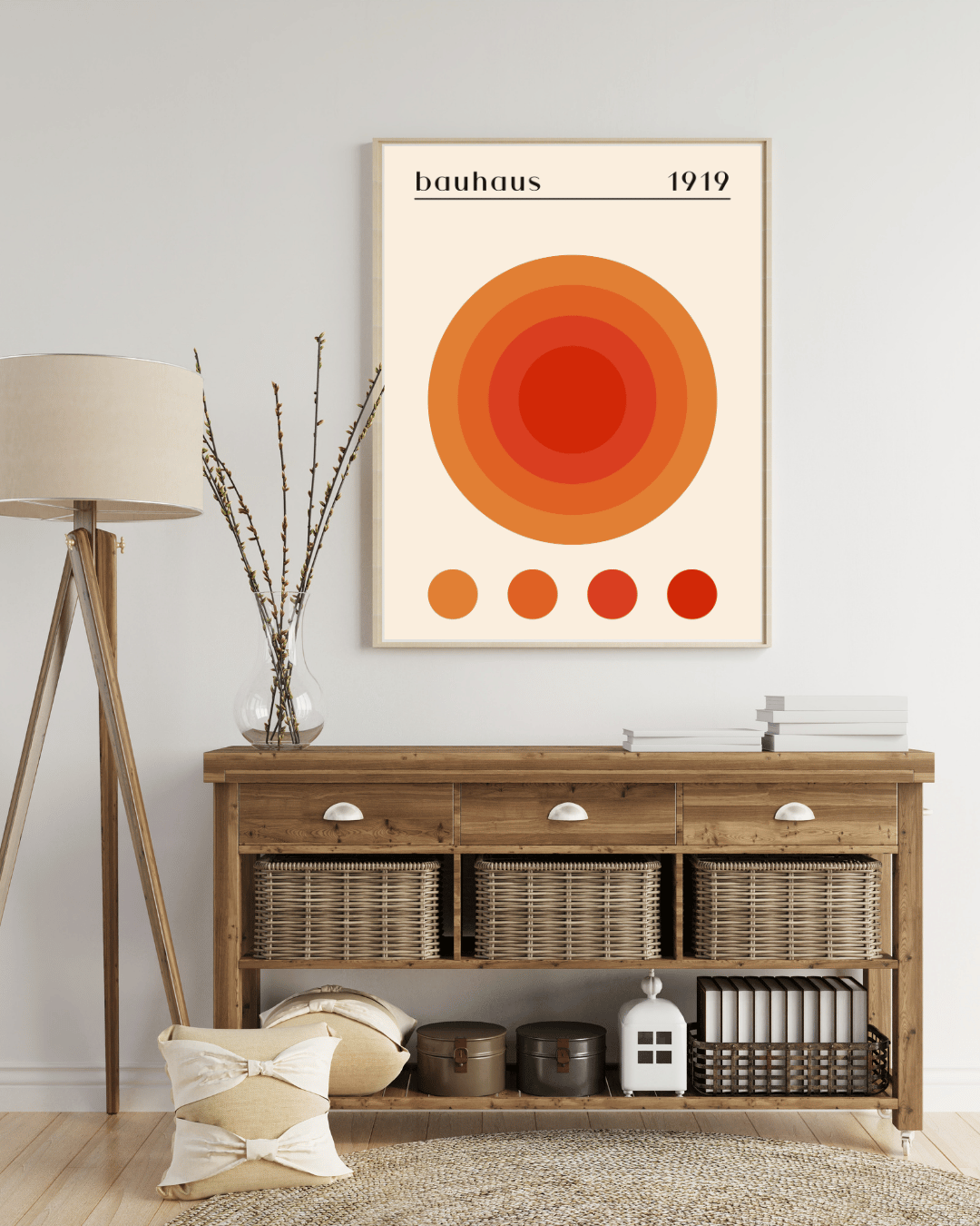 Udtrykket trækker tydelige referencer til Bauhaus-traditionen med fokus på form, farve og funktion, men er fortolket i et enkelt og nutidigt formsprog. Det gør plakaten ideel til dig, der ønsker et skandinavisk udtryk med varme nuancer og grafisk klarhed, som passer naturligt ind i danske boliger.