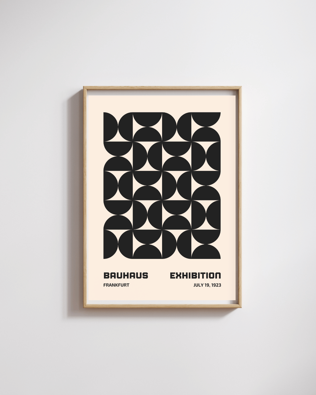 Mønstret fremstår næsten arkitektonisk i sin opbygning og refererer direkte til Bauhaus-bevægelsens fokus på funktion, gentagelse og geometrisk klarhed. Samtidig giver de afrundede former plakaten en blødhed, der gør den let at integrere i både moderne og klassiske rum.
