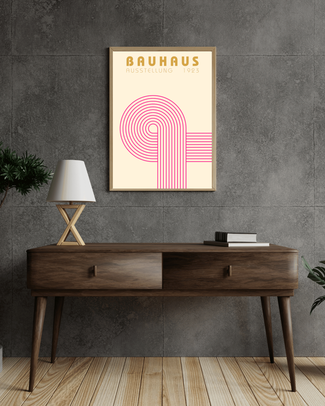 Denne Bauhaus-inspirerede plakat kombinerer grafisk klarhed, retro æstetik og en rolig farvepalette, der passer perfekt ind i det moderne danske hjem. Motivet er opbygget af bløde, gentagne linjer i en markant rosa tone, der står i flot kontrast til den varme, lyse baggrund. Resultatet er et udtryk, der føles både historisk forankret og nutidigt på samme tid.