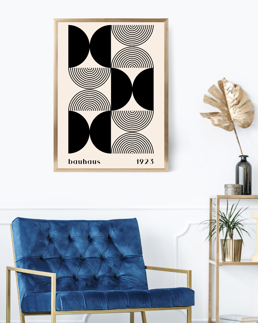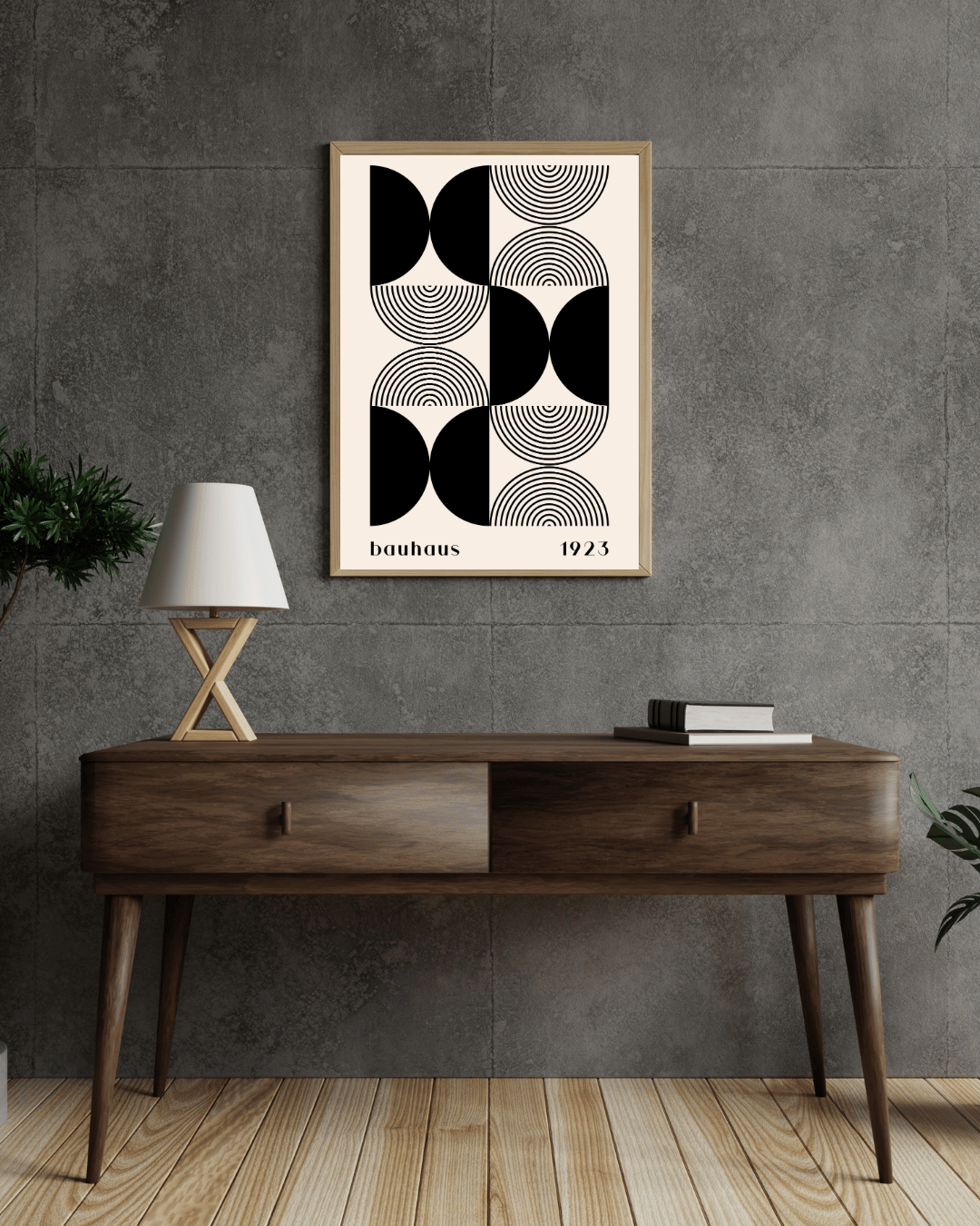 I danske hjem er denne type grafisk plakat oplagt til stue, kontor, entré eller spisestue, hvor den kan skabe sammenhæng og ro på væggen. Den fungerer både stærkt alene og som del af en billedvæg med andre Bauhaus- eller geometriske plakater, hvor den bidrager med struktur og kontrast.