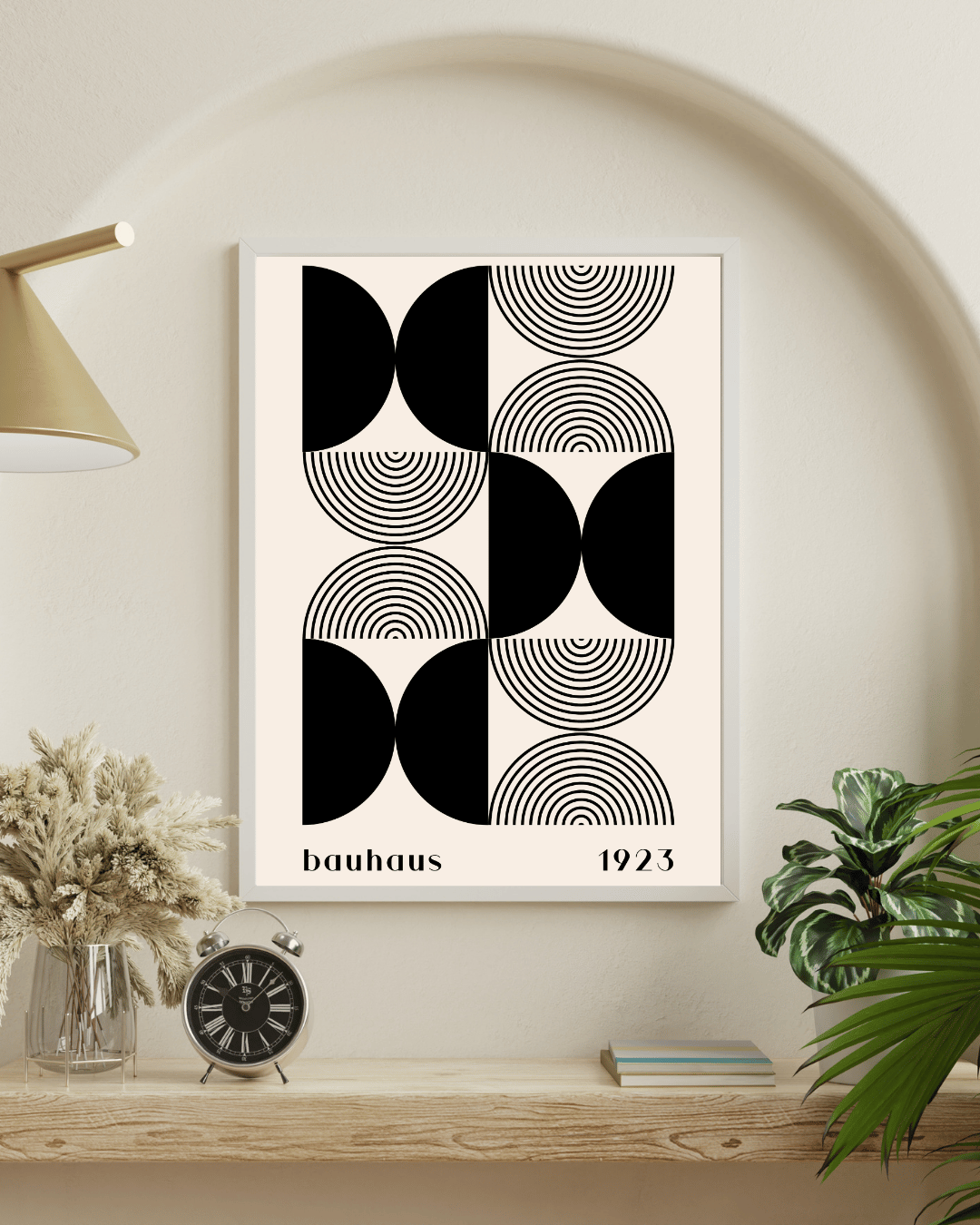 Denne Bauhaus-inspirerede plakat arbejder konsekvent med kontrast, rytme og et stramt grafisk formsprog, der passer perfekt ind i det moderne danske hjem. Motivet er opbygget i et modulært grid af halvcirkler og koncentriske linjer, hvor sort og råhvid spiller tæt sammen og skaber et udtryk, der er både markant og roligt.
