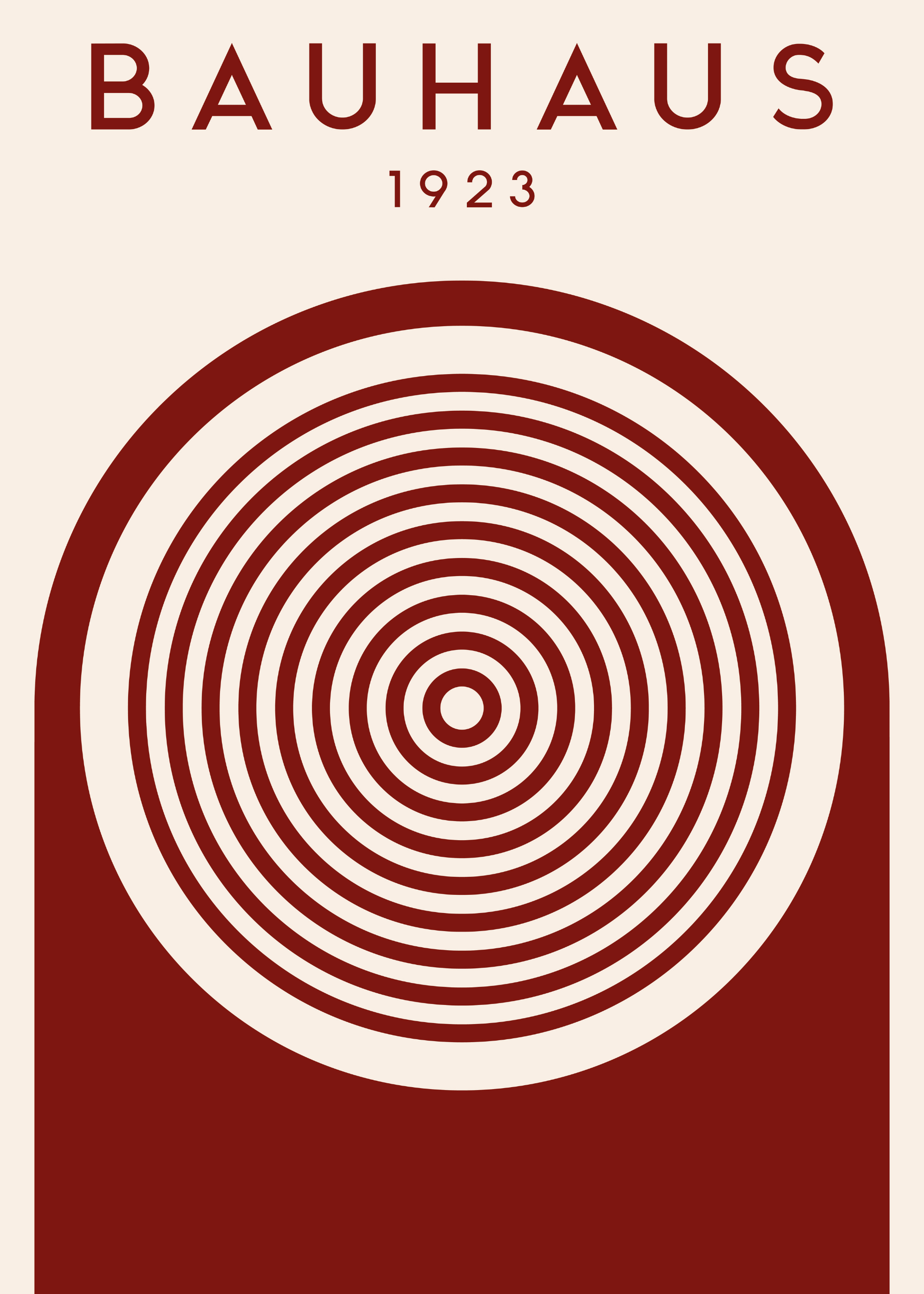 Bauhaus Plakat 49 bygger videre på Bauhaus-bevægelsens fascination af geometri, rytme og gentagelse, her fortolket gennem koncentriske cirkler i en varm, dyb rød tone. Farvesammensætningen mellem den røde bund og den lyse creme skaber et markant, men afbalanceret udtryk, der både er kraftfuldt og roligt på samme tid.