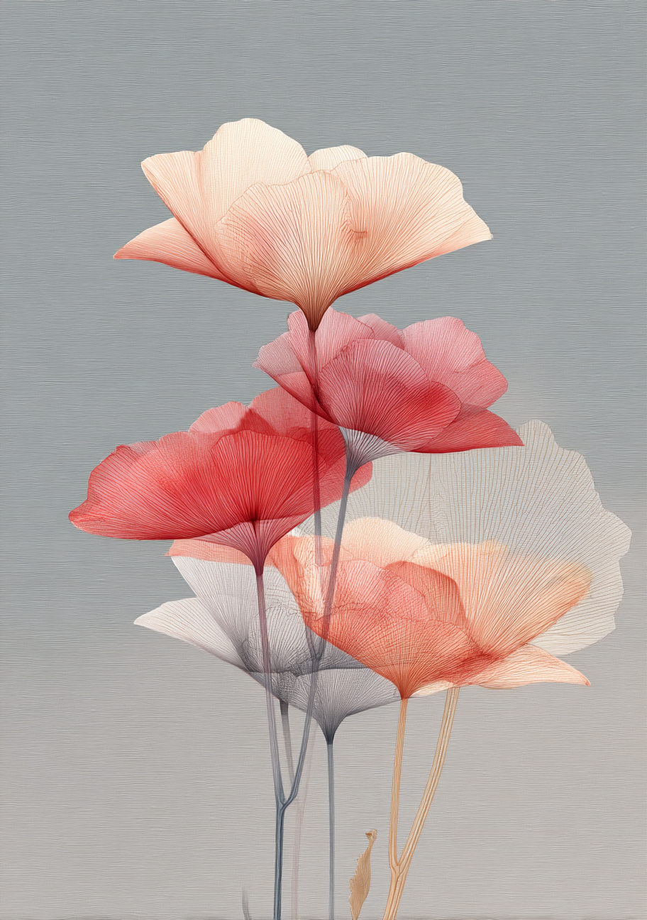 Det karakteristiske for denne plakat er de fine linjer, der løber gennem hver enkelt kronblad – som nervetråde i et levende system. Motivet balancerer smukt mellem minimalisme og detaljerigdom, hvor de elegante blomster står i klar kontrast til en støvet, gråblå baggrund, hvilket fremhæver blomsternes organiske former og naturlige lethed.