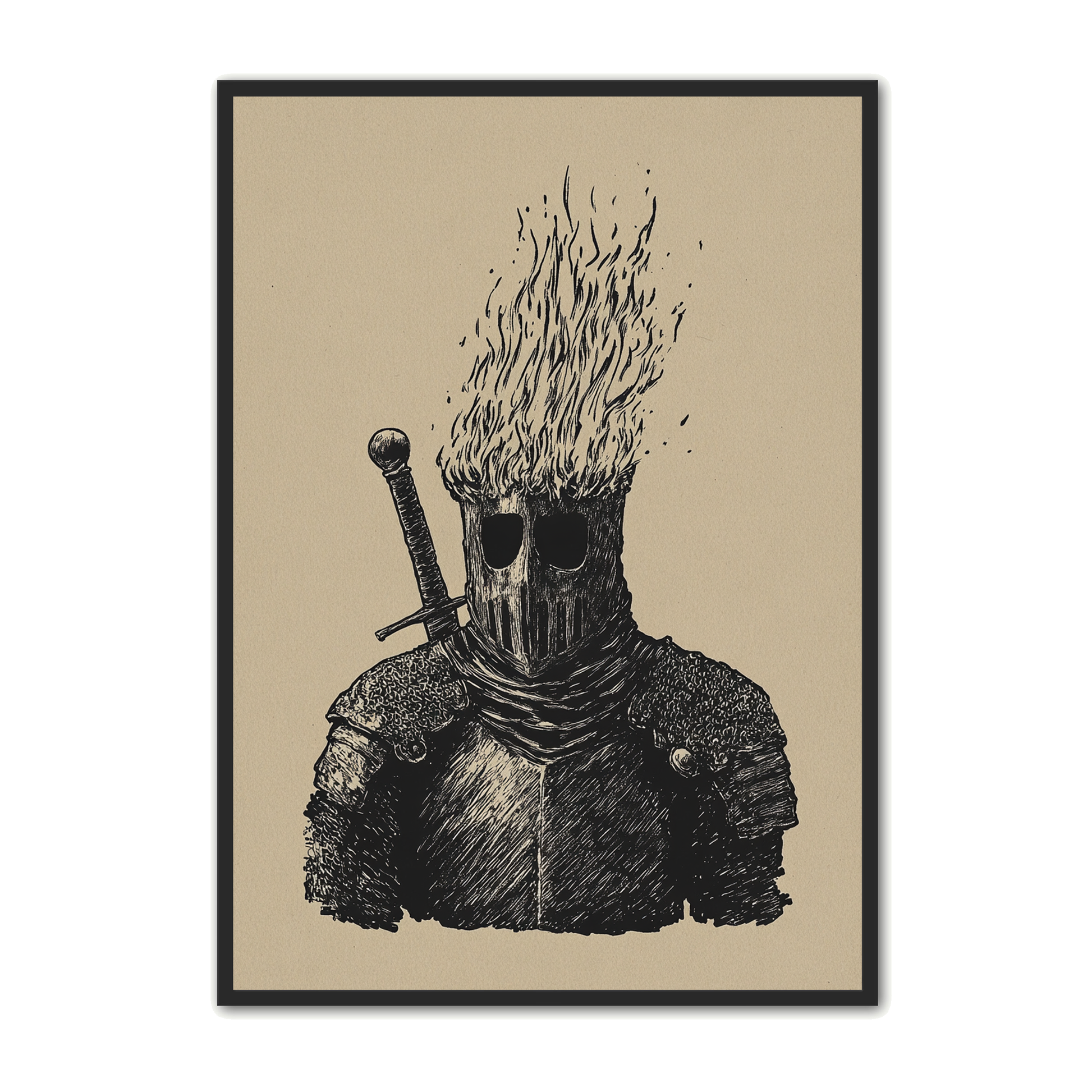 Denne plakat afspejler styrke, mystik og det ukendte. Den flammende hjelm symboliserer en uophørlig kampånd, mens de mørke øjenhuller skaber en uhyggelig og dragende effekt. Perfekt til dig, der ønsker noget unik, karakterfuldt og atmosfærisk i din indretning.