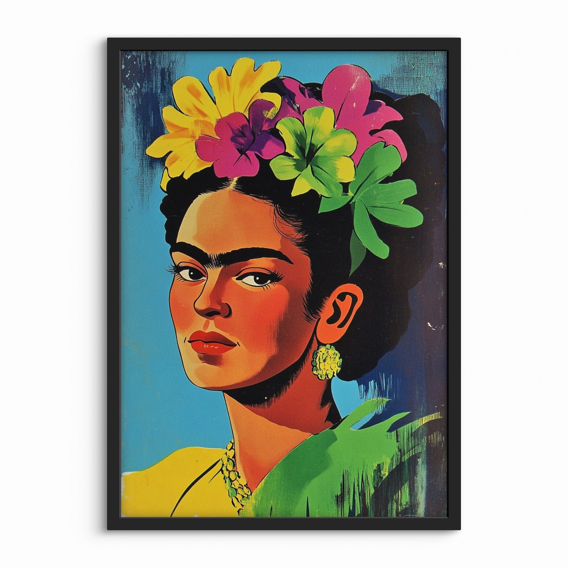 De store blomster i håret – i klare nuancer af gul, lilla, pink og grøn – tilfører motivet et strejf af fest og varme. Den blå baggrund giver plakaten en ren, moderne kontrast, og sammen med de skarpt optrukne linjer og dybe skygger, fremstår motivet både klassisk og opdateret.