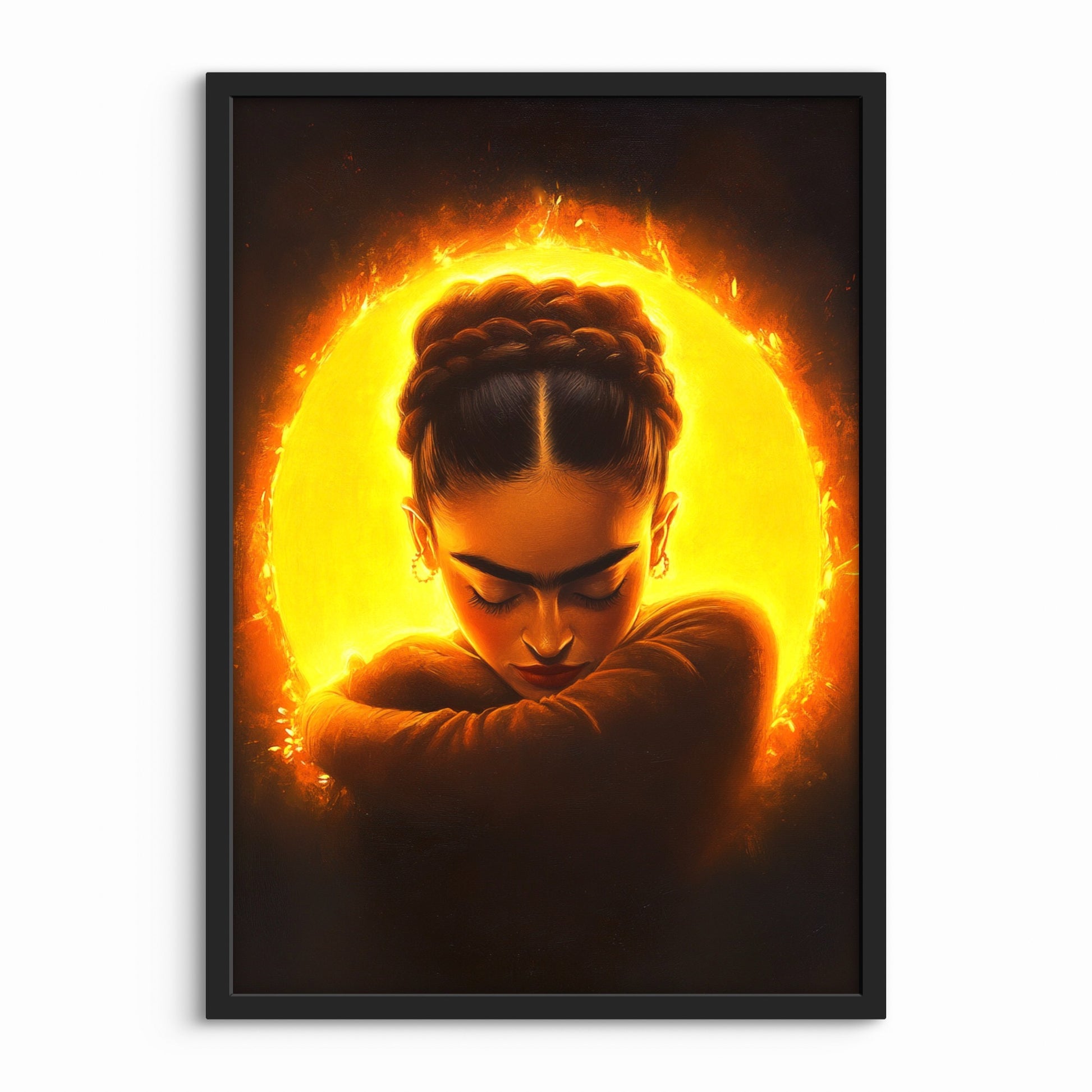Portræt Plakat 96 – Solens Stilhed og Indre Glød er et magisk portræt fyldt med lys og eftertænksomhed. På billedet har hun øjnene lukket og hovedet bøjet – indadvendt, men stærk. Bag hende lyser en flammende sol op i gyldne og orange toner, og skaber en aura af ro, styrke og forvandling.