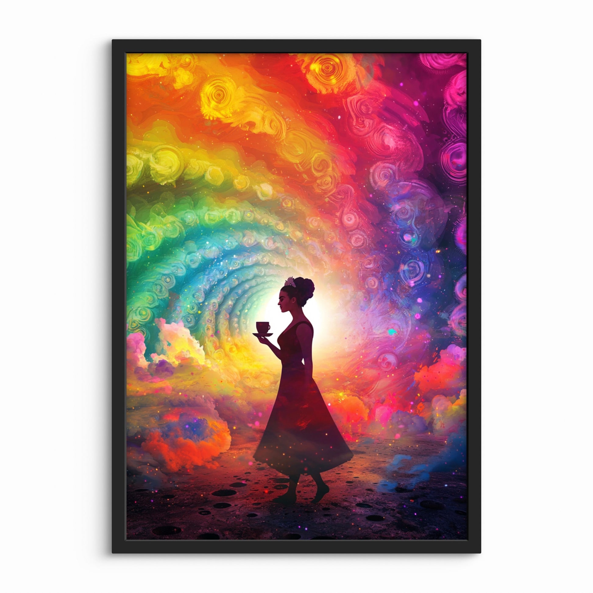 I midten ses silhuetten af hende med oprejst holdning, en kop balanceret i hånden og et udtryk af ro og værdighed. Bag hende folder sig en spindelvævslignende spiral af farver ud – fra dyb lilla til varm gul og eksplosiv pink – som om hele universet er i bevægelse omkring hende. Det er et billede, der taler til fantasien og det underbevidste, og som inviterer til ro midt i kaos.