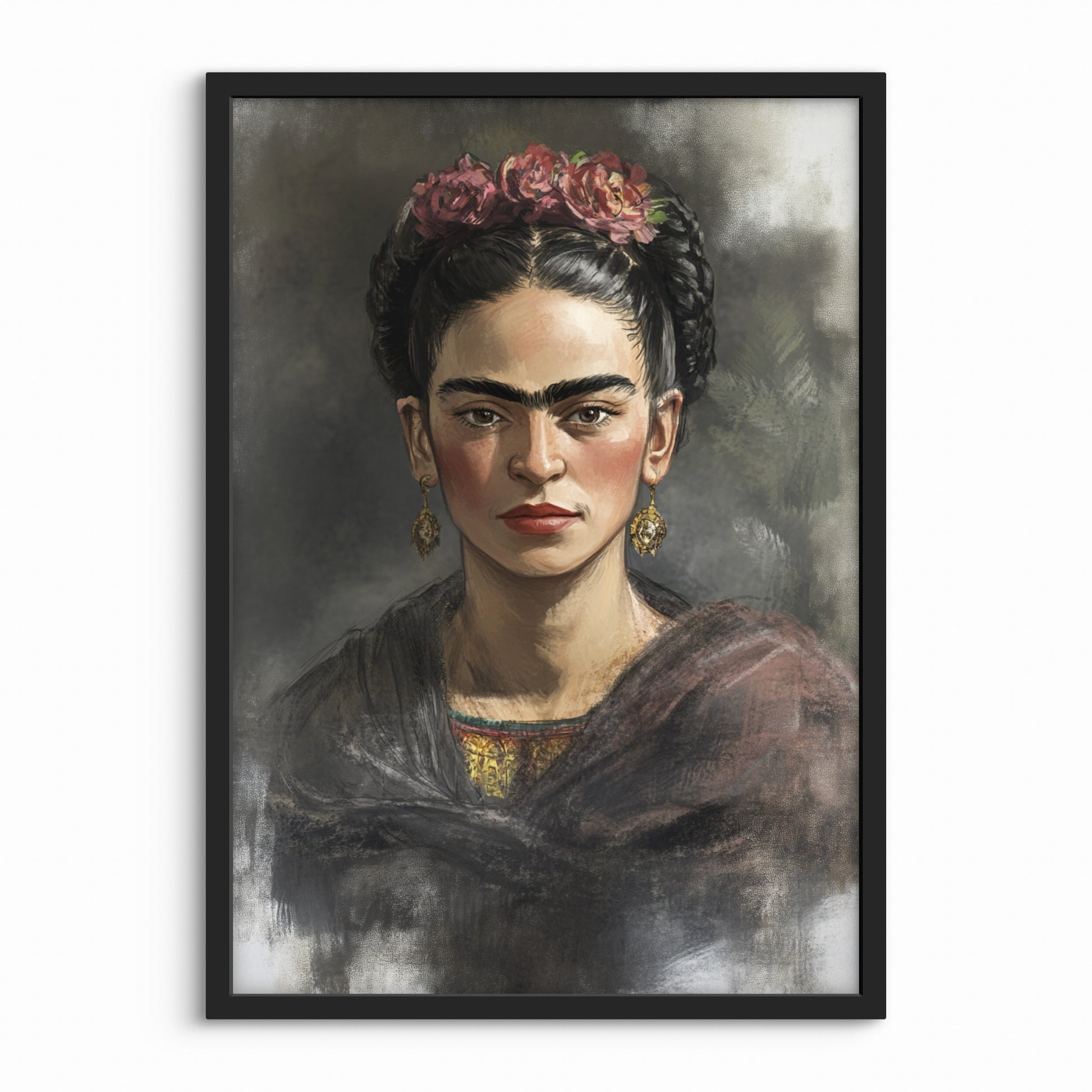 Motivet viser hende med blomster i håret, gyldne øreringe og et udtryksfuldt ansigt, der stirrer lige ind i beskueren med et blik, som er umuligt at ignorere. Den gråtonede baggrund lader hende træde tydeligt frem, og detaljerne i klædedragt og ansigtstræk giver billedet en følelse af tidsløs elegance. Det er en plakat, der passer ind i hjem, hvor man ønsker mere end blot dekoration – man ønsker fortælling og stemning.