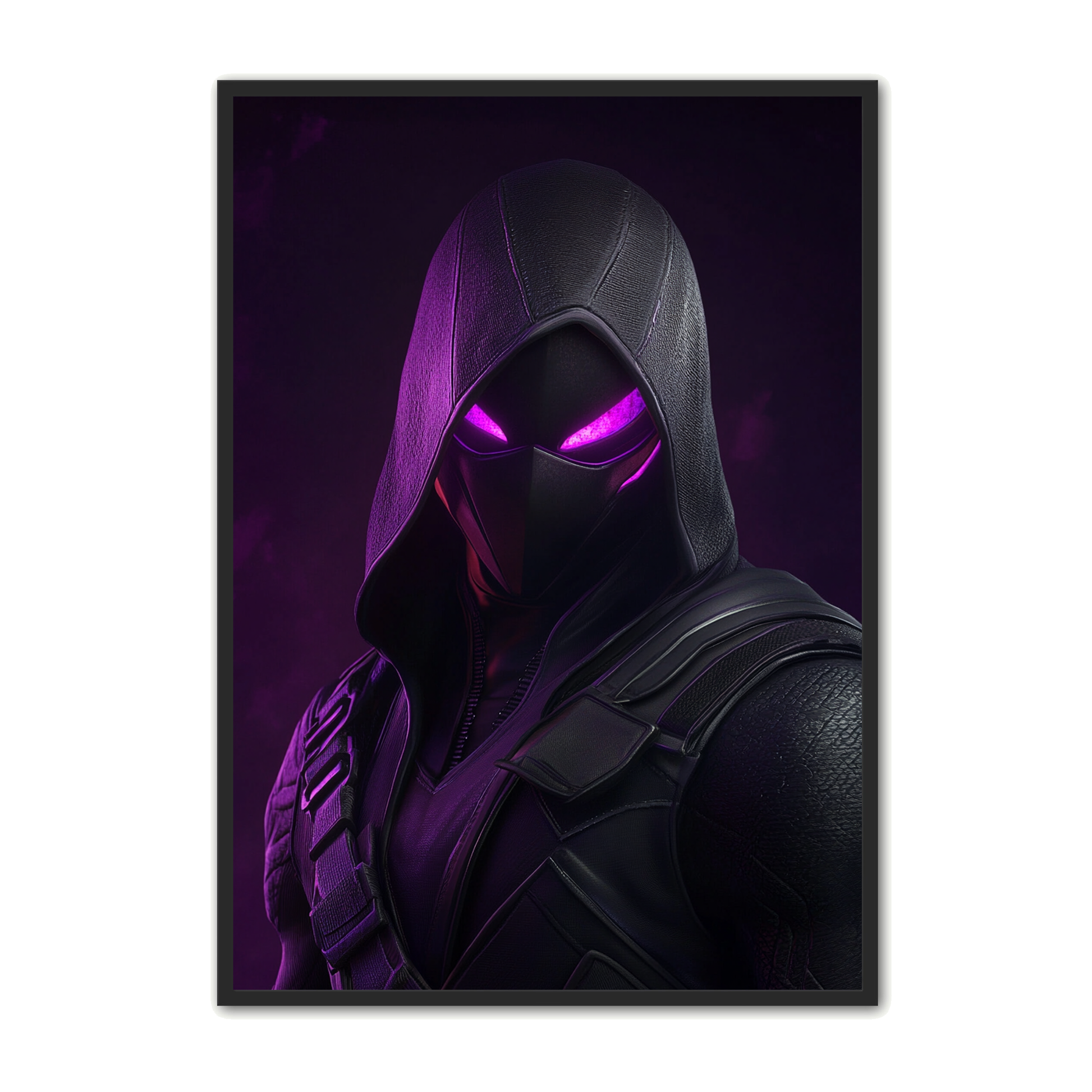 Denne mørke hætteklædte figur emmer af mystik og kraft. De lysende lilla øjne bryder den dunkle baggrund og skaber en intens stemning, der tiltrækker og fastholder blikket. De skarpe detaljer i rustningen og hætten giver et moderne og edgy udtryk.