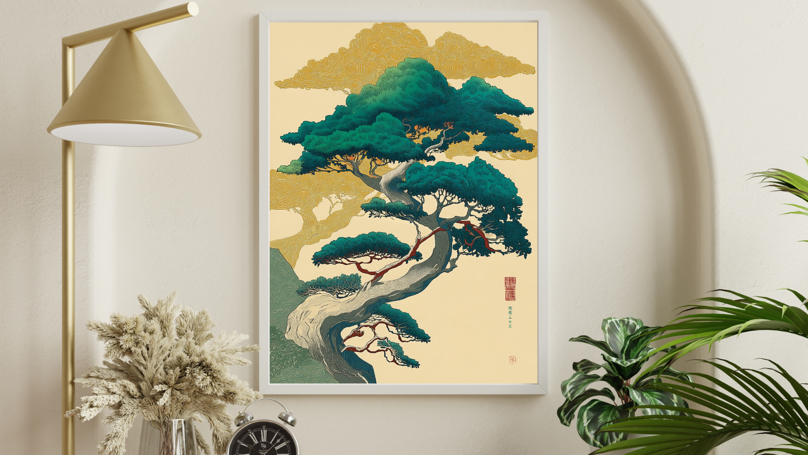 Japansk Plakat 175 – Himmeltræets Ro er inspireret af klassiske japanske træmotiver, hvor naturens kraft møder menneskets ro. Træets buede form symboliserer visdom og udholdenhed, mens de gyldne skyer minder os om fred og fornyelse.