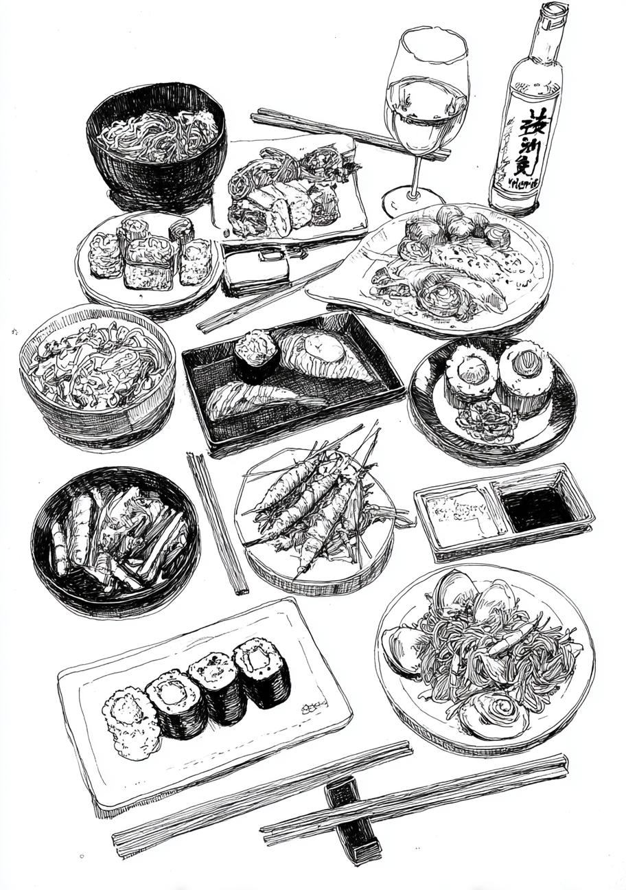 Japansk Plakat 95 indfanger essensen af japansk madkultur gennem et overdådigt bord fyldt med variation. Fra frisk sushi og sprøde rejer til nudler, grillede specialiteter og klassiske bowls. Denne plakat rummer hele følelsen af et traditionelt japansk måltid, hvor små detaljer og store smagsoplevelser mødes.