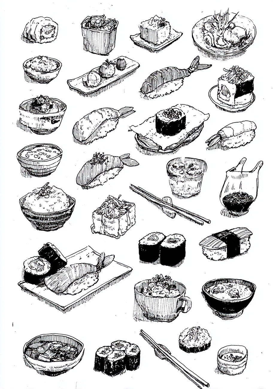 Japansk Plakat 97 er en hyldest til de små detaljer i det japanske køkken. I stedet for ét samlet måltid er her et væld af små bowls, sushistykker, risretter og appetitvækkere, arrangeret side om side. Det giver følelsen af at bladre i en japansk menukort-illustration, hvor hver ret fortæller sin egen historie.