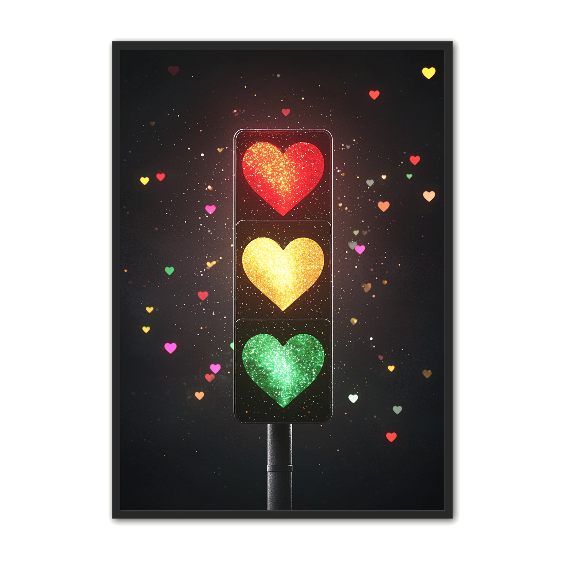 Denne fortryllende plakat forener det velkendte trafiklys med romantikkens varme udtryk. I stedet for klassiske lys er der her glimtende hjerter, der spreder kærlighed og positiv energi. De lysende farver står i smuk kontrast til den mørke baggrund, mens de små, farverige hjerter svæver i luften og skaber en stemning af magi og glæde.