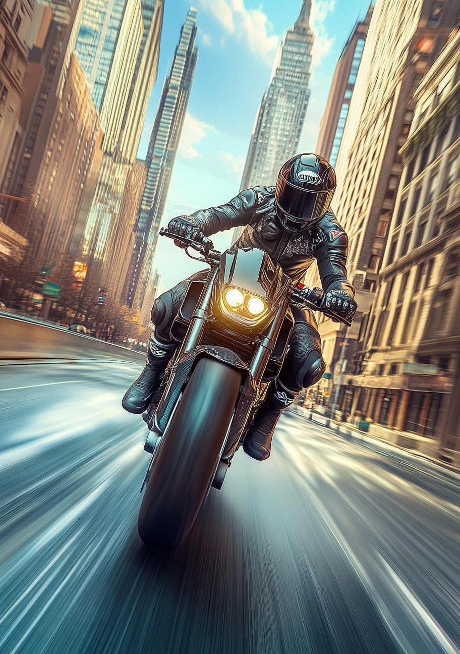 Der er noget uimodståeligt ved følelsen af frihed, fart og rå energi – og netop dét fanger Motorcykel Plakat 2 - Fart i Byens Puls med imponerende kraft. På denne dynamiske plakat ses en motorcyklist i fuld fart gennem storbyens gader, omgivet af tårnhøje bygninger og smeltende lysspor, der understreger bevægelsen og den elektriske stemning.