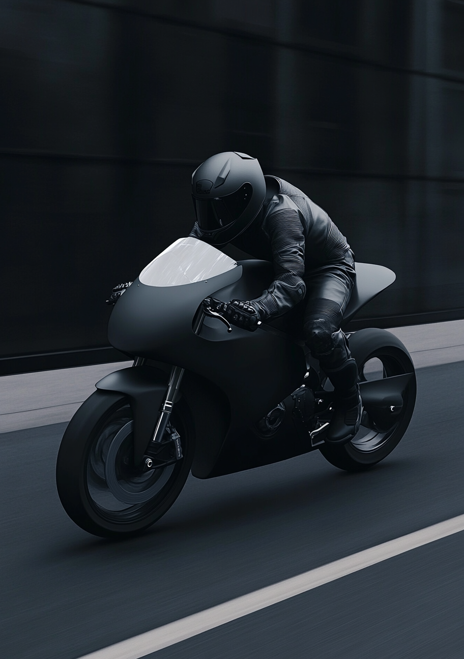Der er en særlig æstetik i sort. Det er farven, der aldrig går af mode. Den er tidløs, kompromisløs og bærer en helt særlig tyngde. På denne plakat er det netop denne kraft, der kommer til udtryk. Motorcyklisten bliver næsten én med maskinen – et flydende symbol på fart, frihed og disciplin. Den skinnende visir er det eneste, der bryder mørket og tilføjer en subtil kontrast, der tiltrækker blikket.
