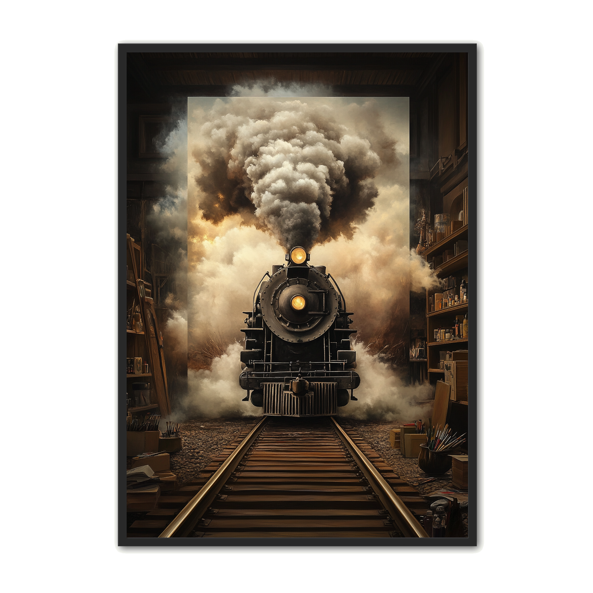 Denne plakat er perfekt til at skabe et stærkt udtryk i din indretning. De varme farver og de levende detaljer gør den oplagt som et centralt element i stuen, på kontoret eller i et kreativt arbejdsrum. Den kraftfulde kombination af det tunge damptog og atelierets rolige rammer skaber en kontrast mellem bevægelse og stilstand – et motiv, der fanger øjet og løfter rummet.